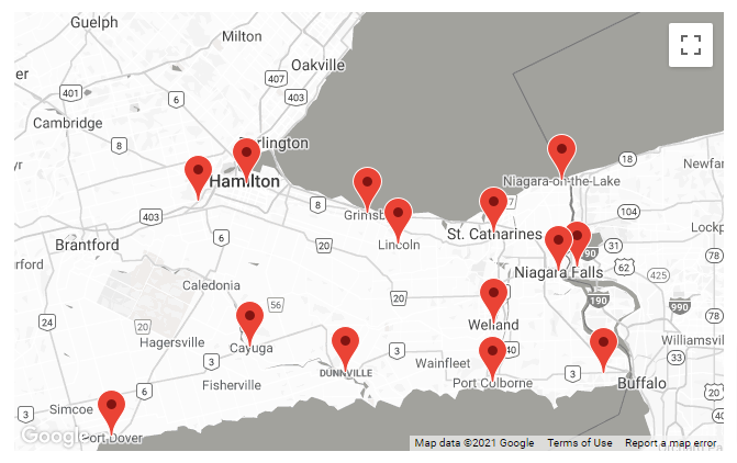 Beamsville – Chippawa – Crystal Beach – Fenwick – Fonthill – Niagara On The Lake – Port Colborne – Port Robinson – Ridgeway – Stevensville – St. Catharines – St. Davids – The Niagara Peninsula – Thorold – Virgil – Vineland – Wainfleet – Wellandport